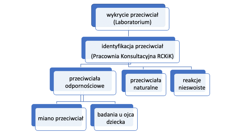 Stwierdzenie obecności przeciwciał w badaniu przeglądowym w pracowni immunologii transfuzjologicznej (w laboratorium) wiąże się z koniecznością ich identyfikacji, tzn. stwierdzenia jakie to są przeciwciała i czy mają znaczenie kliniczne w aktualnej ciąży.
