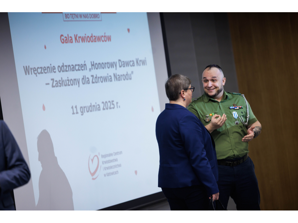 11 grudnia 2025 r. w Centrum Konferencyjnym Superauto.pl Stadionu Śląskiego odbyła się gala wręczenia odznak „Honorowy Dawca Krwi – Zasłużony dla Zdrowia Narodu”. W uroczystości wzięli udział: Michał Szafrański – Dyrektor Regionalnego Centrum Krwiodawstwa i Krwiolecznictwa w Katowicach, Aleksandra Krzyżowska – Zastępca Dyrektora ds. Medycznych, Kewin Baranowski – Dyrektor Śląskiego Oddziału Okręgowego PCK, a także najważniejsi bohaterowie tego dnia – zasłużeni Honorowi Dawcy Krwi wraz ze swoimi bliskimi.
